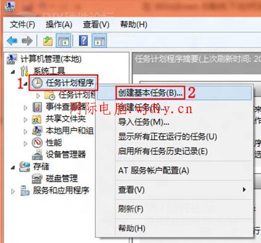 第2步、在彈出的計算機管理窗口,使用鼠標左鍵單擊左側的“任務計劃程序”使其為選中狀態,然后再點擊鼠標右鍵彈出菜單并選擇“創建基本任務(B)…”。如下圖所示: