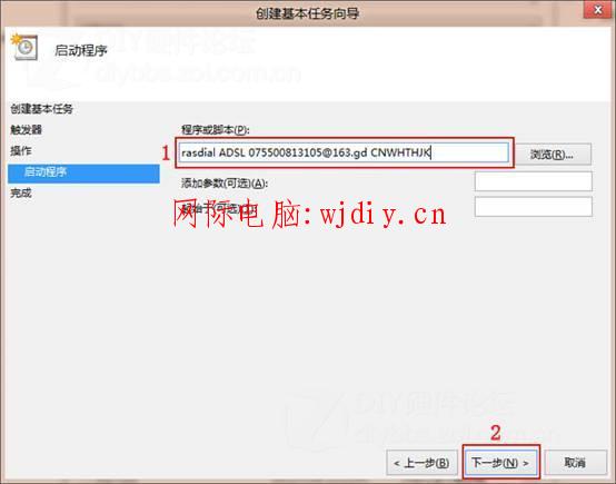 第6步、在啟動程序或腳本設置界面,在標注“1”位置處鍵入“rasdial ADSL 075500813105@163.gd CNWHTHJK”,然后在標注“2”處點擊“下一步(N)”按鈕。如下圖所示: