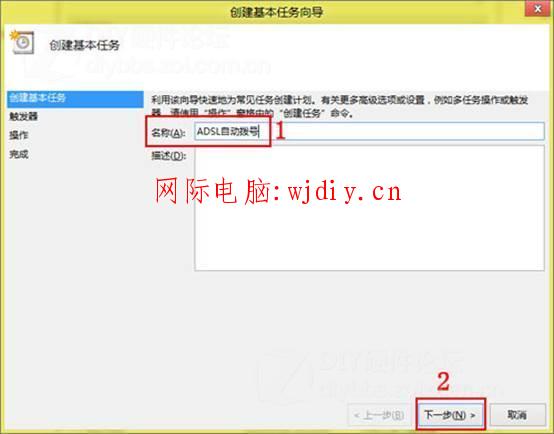 第3步、在彈出的創建基本任務向導對話框中,在下圖標注“1”處鍵入任務名稱如:ADSL 自動撥號,然后點擊標注“2”處的“下一步(N)”按鈕。如下圖所示: