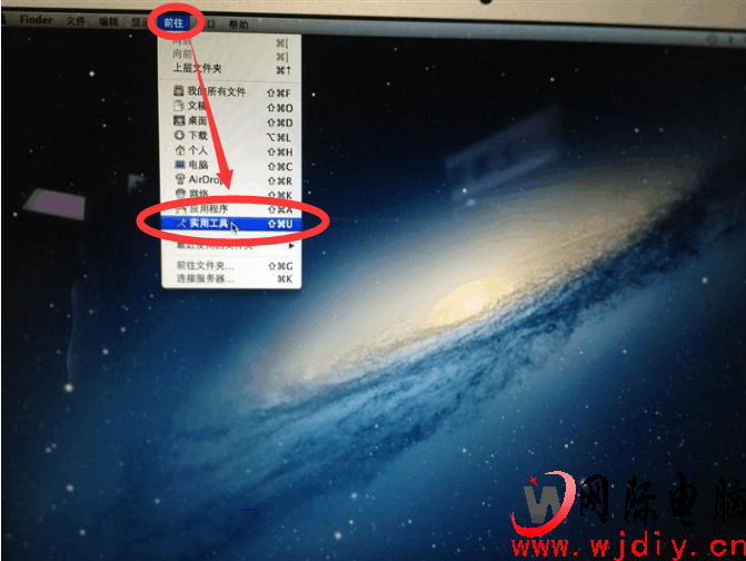 今天網際電腦教大家MacBook裝雙系統一步一步教程:第一步:mac電腦先開機、把WIN7 64位的盤放進去!光驅入口在電腦的右手側面!第二步:打開屏幕的左上角‘前往’里面的‘實用工具’!如下圖: