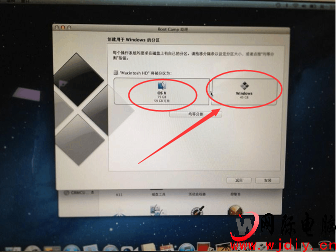 第五步:如圖所示、總容量是500G硬盤!上面是分區的格式 1、MAC OS X是蘋果系統、2、Windows 7 中間是分割線你可以用鼠標點擊滑動分區大小!磁盤分區好 點擊安裝然后會自動重啟!如下圖:
