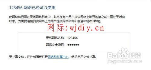 1.出現如下提示,說明無線網卡已經把有線連接共享出去了。如圖,用支持wifi的設備搜索一下,就可以發現名為123456的無線網絡了。連接時的密碼填入設置時的安全密鑰即可成功連接。