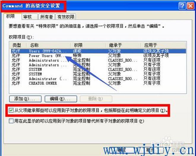 1.將“從父項(xiàng)繼承那些可以應(yīng)用到子對(duì)象的權(quán)限項(xiàng)目,包括那些再次明確定義的項(xiàng)目”前面的對(duì)號(hào)去掉,如圖1