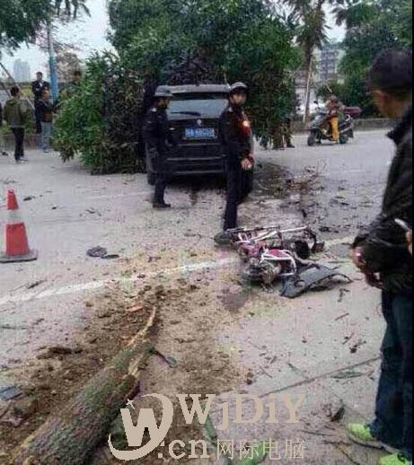 據目擊者描述這輛黑色轎車當時的行車路線,是沿著這條鳳凰北路,南往北行駛,當來到前方這個丁字路口的時候,車輛突然失控地沖上來人行道上,當時,在路邊第二棵樹旁邊有一男一女小學生及他們的媽媽,轎車是將兩名小學生撞倒,之后車輛繼續往前方開,大概是來到這個位置將一名50歲左右的阿姨撞倒,接著,車輛往前方金寶酒店開,撞上了酒店對出空地上的一棵樹,將樹撞斷。