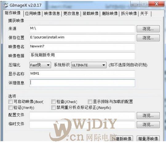 3.重啟進入原來Win7系統,同上運行“VHD_OneKey_2011_51.exe”并切換到“掛載/卸載VHD”,按提示加載 “J:\WIN7_VHD\win7_v.vhd”文件,假設加載后的盤符為M:,成功加載后將“C:\boot”目錄、“C:\bootmgr”文件全部復制到M盤根目錄下。最后運行下載到的“Gimagex”,切換到“制作鏡像”,然后依次執行下述的設置: