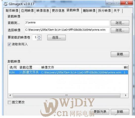 最后單擊“裝載”,按提示將安裝鏡像1裝載到“J:\winre”目錄中(下圖4)。3.成功裝載完鏡像后,按提示將下載到的“imagex.exe”復制到“J:\winre\Windows\System32”;下載到的“tools”文件夾復制到“J:\winre\sources\recovery”下。最后返回Gimagex界面,選中加載的“winre.wim”文件,勾選“提交更改”并單擊“卸載”,將修改過的“winre.wim”保存并卸載。