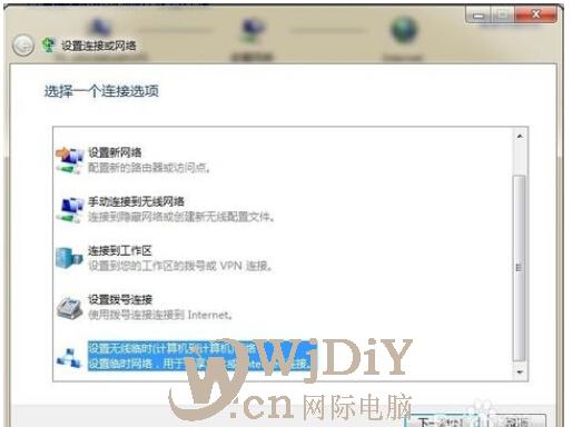 彈出對(duì)話框,點(diǎn)擊--設(shè)置無線臨時(shí)(計(jì)算機(jī)到計(jì)算機(jī))網(wǎng)絡(luò)--下一步