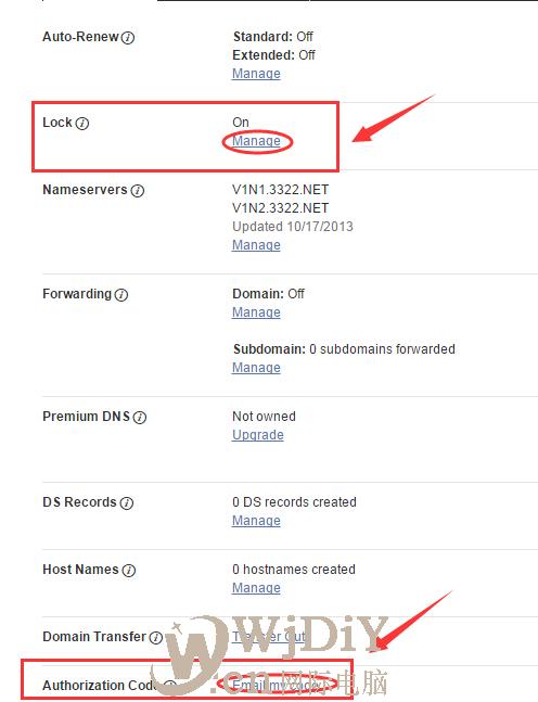 第三步、進入域名管理面板,點擊Locked后面的Manage解鎖,如下圖所示: