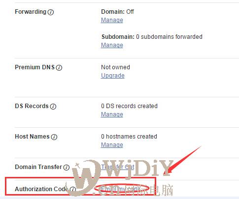 第四步、發(fā)送godaddy域名轉(zhuǎn)出轉(zhuǎn)移碼,點擊Authorization Code后面的Email by code,如下圖所示: