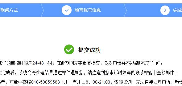 逾期未收到申訴結(jié)果者,可致電客服010-59059588(周一至周日8:00-21:00,僅限咨詢(xún),無(wú)法直接處理申訴,敬請(qǐng)諒解)。