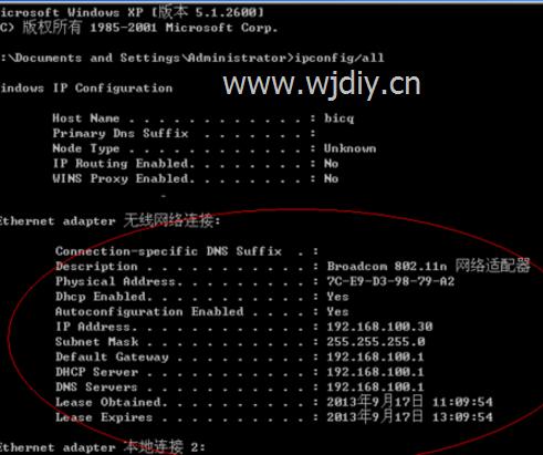 Windows鍵+R鍵------出現“運行”窗口------輸入“cmd”----按回車鍵---出現“命令提示符”對話框-------輸入“ipconfig/all”回車查看是否獲取到了ip地址。