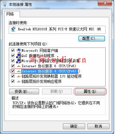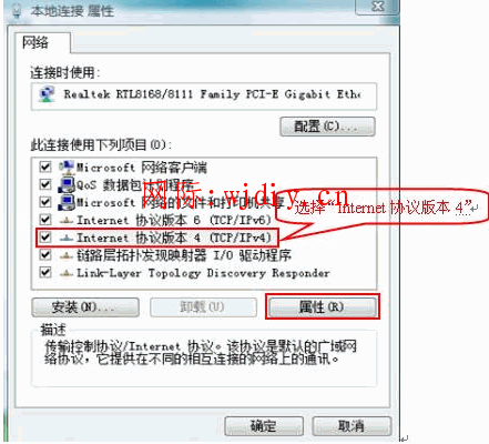 在網卡對應的“本地連接”選擇“屬性”→“網絡”→“Internet協議版本4(TCP/IPv4)”,點擊“屬性”: