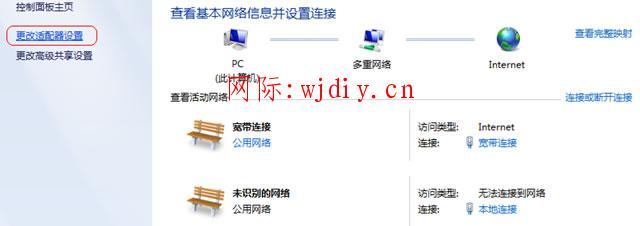 右擊桌面“網上鄰居”-選擇“屬性”,打開網絡共享中心,在網絡管理側邊欄中選擇“更改適配器設置”: