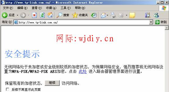 為了抵御越來越猖獗的蹭網行為,提醒廣大TP-LINK用戶注意無線網絡安全,所有型號的無線路由器增加了防蹭網安全提示頁面,如下圖所示: