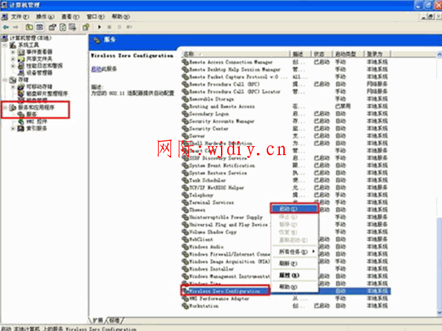 2、選擇“ 服務與應用程序”—“服務”,選擇右邊窗口中的 “Wireless Zero Configuration”按右鍵選“啟