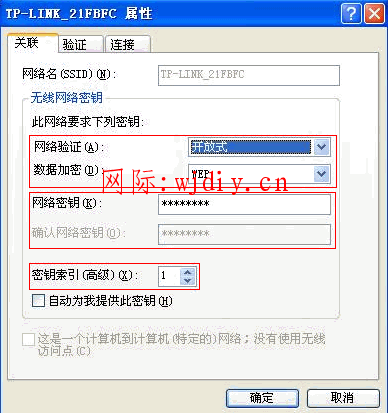 4、核對網絡驗證、數據加密、網絡密鑰設置是否和無線路由器中相同,如果是WEP加密,請確保密鑰索引選擇和