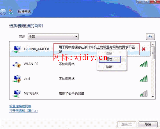 Vista系統(tǒng),無線連接提示“用于網(wǎng)絡(luò)的保存在該計算機上的設(shè)置與網(wǎng)絡(luò)的要求不匹配”。如下圖: