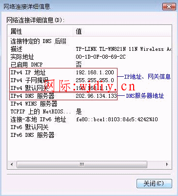 這里可以查看您本機無線網絡連接的IP地址等信息,請檢查IP地址、網關、DNS服務器地址是否配置正確,正確配置