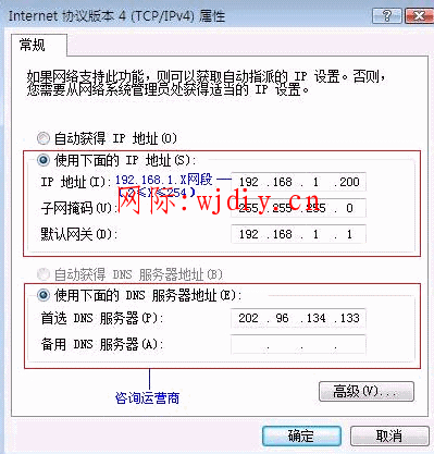 設置IP地址和路由器同一網段,DNS服務器地址請向網絡運營商咨詢。