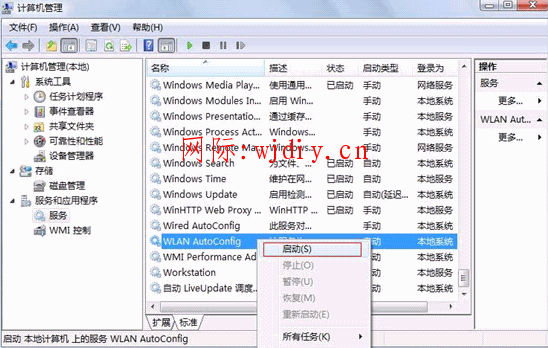 2. 選擇“服務和應用程序”中的“服務”,在右邊列表中找到“WLAN AutoConfig”,右鍵選擇“啟動”。
