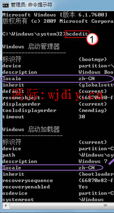 在命令窗口中鍵入bcdedit,然后按一下回車鍵。請檢查一下Windows啟動管理器和Windows啟動加載器下locale對應的語言是否與您Win7系統語言一致。
