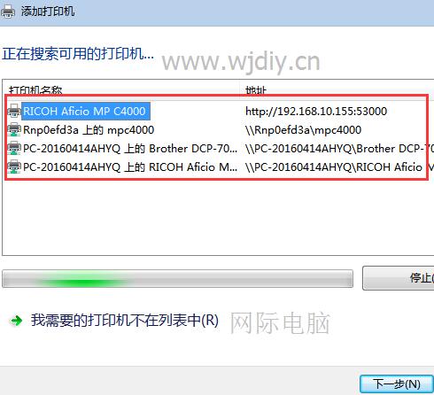 在彈出的添加打印機搜索的共享打印機;選擇下一步就可以了