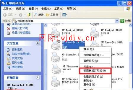在“打印機(jī)和傳真”窗口中,右鍵點(diǎn)擊您使用的打印機(jī)圖標(biāo),選擇“使用聯(lián)機(jī)打印機(jī)”菜單項(xiàng)。如圖 1 使用聯(lián)機(jī)打印機(jī)所示: