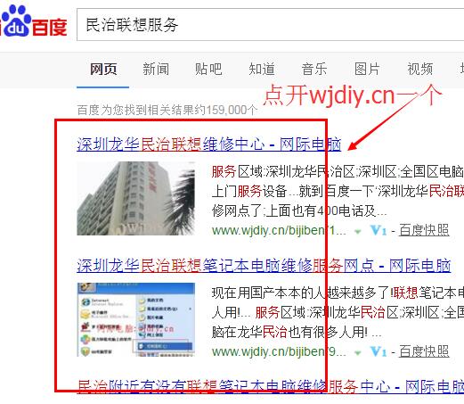 第二步:點開上圖關鍵詞就是百度頁面了;從百度頁面結果找到wjdiy.cn相關網頁;如下圖'民治聯想服務'