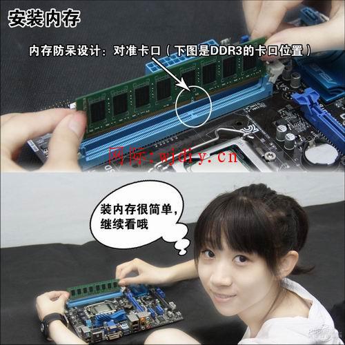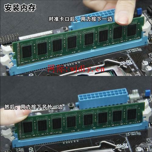 內存的安裝很容易,對準內存與內存插槽上得凹凸位,分別左/右用力下,聽到“啪”的一小聲,左/右卡位會自動口上,然后再用同樣方法壓好另一邊即可。值得注意的是,現在有一些主板,為方便安裝顯卡,只設置了一個卡位,而安裝方法是一樣的。