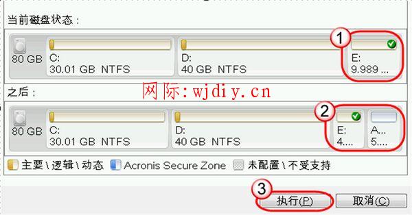 第五步:彈出分區預覽摘要窗口,上面的圖形列出的是當前分區的狀態,下面的圖形列出的是調整后的分區分配狀態,如果確定無誤,點擊“執行”按鈕。
