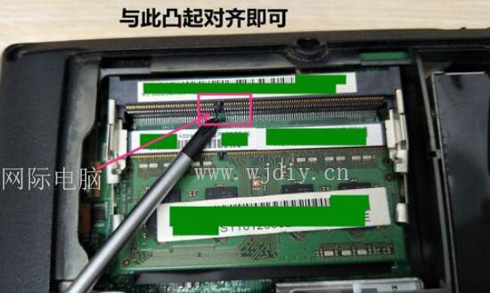 第二步驟:打開電腦后蓋,在T型區域左上角就是添加內存條的地方;插入內存條:首先確定正反面,在內存條上有一個小口(缺口),只需將此小口與內存條插座上的凸起對齊即可,如圖所示
