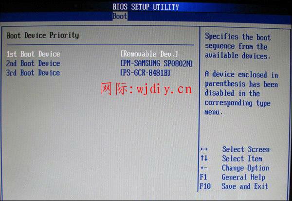 如果在圖1-2的硬盤驅動器“Hard Disk Drives”里面還沒選擇U盤為第一啟動設備,那么這里就不存在和顯示U盤,如上圖2-2所示,但可以選擇移動設備“Removable Dev.”作為第一啟動設備;