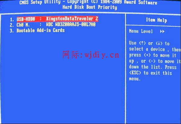 上圖3:硬盤啟動優先級(Hard Disk Boot Priority)選擇:使用小鍵盤上的加減號“+、-”來選擇與移動設備,將U盤選擇在最上面。然后,按ESC鍵退出,回到圖2的設置界面。