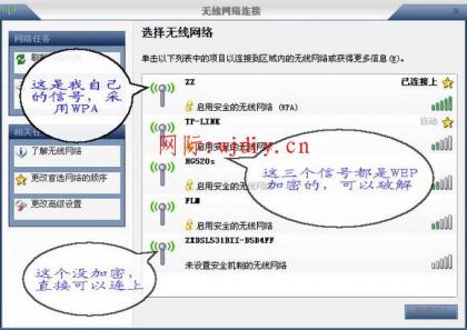 開始我們的WEP解密之旅: 一準(zhǔn)備篇 1、一個有可破解無線信號的環(huán)境。如我在家隨便搜索出來的信號。 2、帶無線網(wǎng)卡的電腦一臺(筆記本臺式機均可,只要無