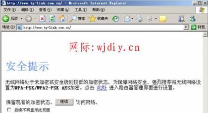 為了抵御越來越猖獗的蹭網行為,提醒廣大TP-LINK用戶注意無線網絡安全,TP-LINK所有型號的無線路由器增加了防蹭網安全提示頁面,如下圖所示...