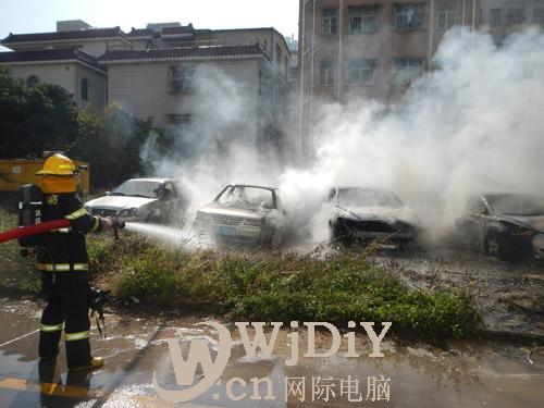 12月14日上午,一輛停在深圳坂田楊美村一空地的汽車突然起火,并殃及了旁邊3輛車。坂田消防中隊在撲救這起火災過程,其中一車的油箱發生爆裂,燃油漏出,猛烈燃燒,消防員處理得當,沒有人員傷亡。附