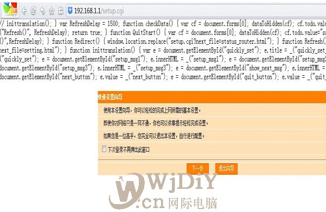 有一位網(wǎng)友問(wèn):為什么我在設(shè)置無(wú)線路由器時(shí),打開(kāi)http://192.168.1.1出現(xiàn)亂碼;而且出現(xiàn)這個(gè)頁(yè)面,點(diǎn)“下一步”和“退出向?qū)А倍紱](méi)響應(yīng)。網(wǎng)絡(luò)正常著;電腦、手機(jī)都用的是無(wú)線路由器發(fā)出
