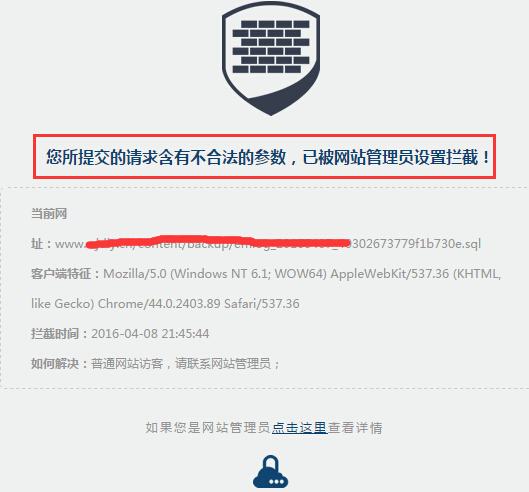 1. 訪問(wèn)別人的網(wǎng)站出現(xiàn)“您所提交的請(qǐng)求含有不合法的參數(shù),已被網(wǎng)站管理員設(shè)置攔截”的提示,請(qǐng)聯(lián)系網(wǎng)站管理員。出現(xiàn)該問(wèn)題的原因是用戶(hù)訪問(wèn)網(wǎng)站觸發(fā)了云鎖的攔截所致。