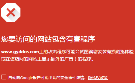 今天打開友情網(wǎng)站報(bào)錯(cuò)www.gyddos.com上的攻擊程序可能會(huì)試圖騙您安裝有損瀏覽體驗(yàn);如下圖 您要訪問的網(wǎng)站包含有害程序(圖)www.gyddos.