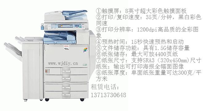 深圳地鐵大廈出租打印機租賃 福田區委新天CBD大廈出租復印機租賃 07550-33942288理光MP C4502/C5502(九成新)A3幅面全彩多功能復合機 功能參數 連續輸出速度:黑白/彩色