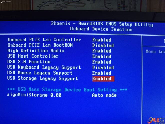 注意把圖中高亮部分設置為Enable,保存BIOS后,重新啟動,再次進入BIOS設置,回到這個菜單的時候,就可以在最下面一行看到U盤已經被識別出來了