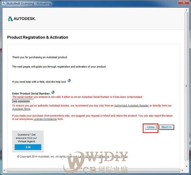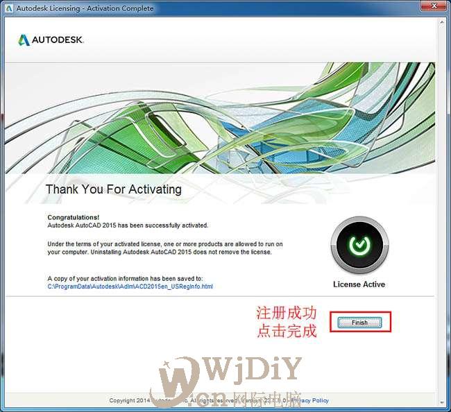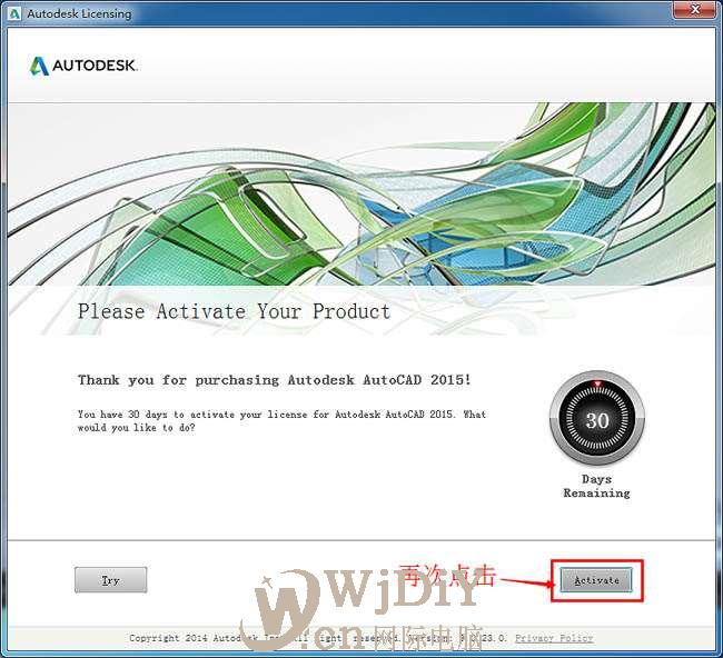 這時(shí)提示我們要激活CAD2015 64位英文版,點(diǎn)擊激活(Activate)。 第十二步:點(diǎn)擊關(guān)閉(close)