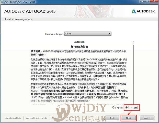 這里選擇國(guó)家或地區(qū)為"china",然后選擇我接受許可協(xié)議,再點(diǎn)下一步(I Accept) 第四步:安裝CAD2015軟件信息