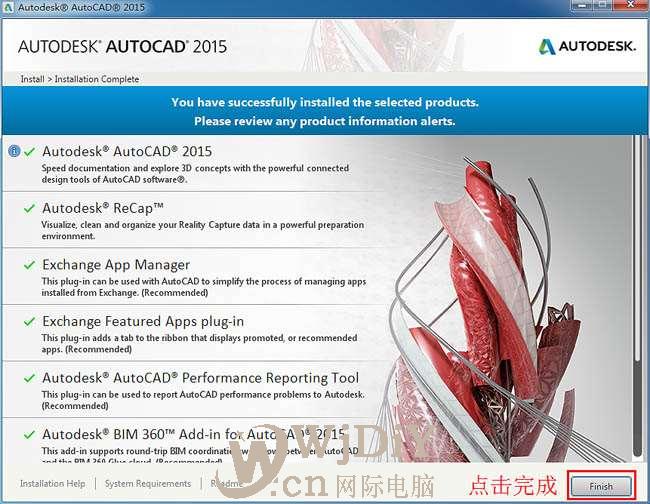 CAD2015 64位英文版的安裝大概需要幾分鐘時(shí)間,請(qǐng)耐心等待。 第七步:CAD2015 64位英文版安裝完成