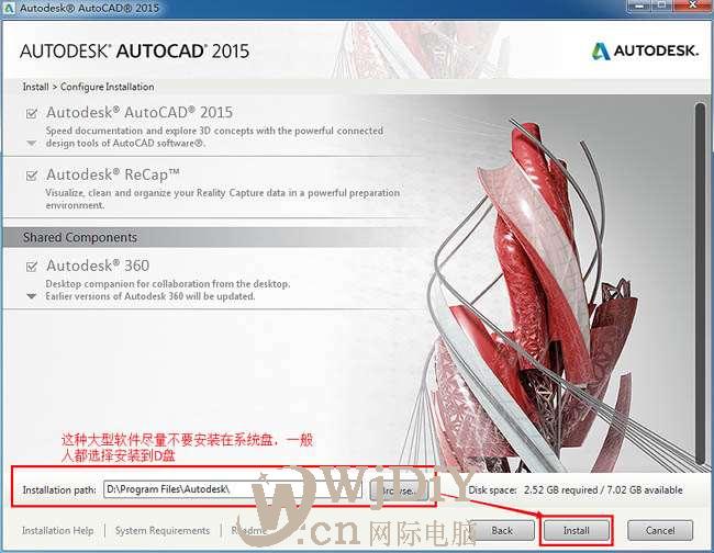 這種大型軟件盡量不要安裝在系統(tǒng)盤,找個(gè)空間足的盤,本人習(xí)慣將所有軟件都安裝到D盤,設(shè)置好盤符就點(diǎn)擊安裝。第六步:CAD2015 64位英文版安裝進(jìn)度