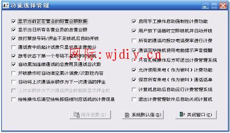 為了適應不同用戶的不同功能需求,本計費管理系統提供了的一系列功能選項,各用戶可根據實際的功能需求來進行相應的設置。同樣為了系統的安全起見,只有操作級別屬于系統管理員及以上級別的操作用戶方能進行這一操作。以系統管理員登錄后單擊主窗口界面上的“功能選擇”命令按鈕,進入功能選擇操作,屏幕上顯示的功能設置界面如