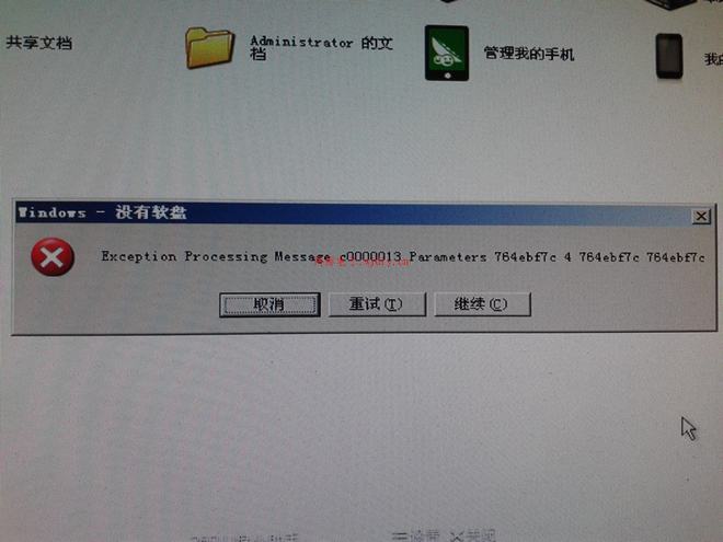 Windows沒有軟盤,內容是Exception Processing Message c0000013 Parameters 764ebf9c 4 764ebf9c 764ebf9 提示下面有三項選擇:取消 重試 繼續 無論選哪個次對話框還是重復出現。。。。圖文如下: