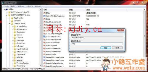 第三步:找到HOKE_CURRENT_USER-Control_Panel-Mouse-MouseHoverTime,雙擊它,設置數值為100。這樣鼠標移動到任務欄的時候就會立即顯示縮略內容。增加了電腦操作的流暢性。