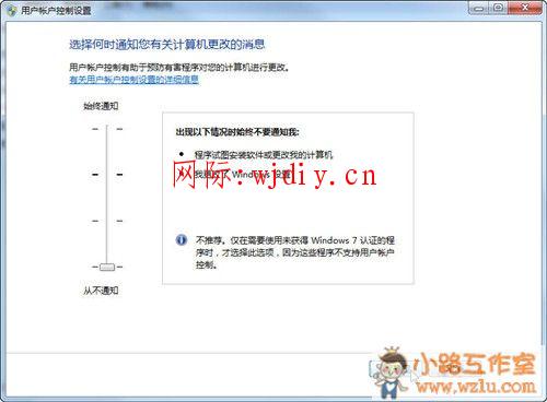 第四步:設置合適通知有關計算機更改的消息,選擇從不通知。其實更改通知一點用處都沒有,因為你電腦都配有安全軟件,電腦更改的時候,安全軟件會通知你的,沒有必要讓系統自己操心。浪費電腦資源。