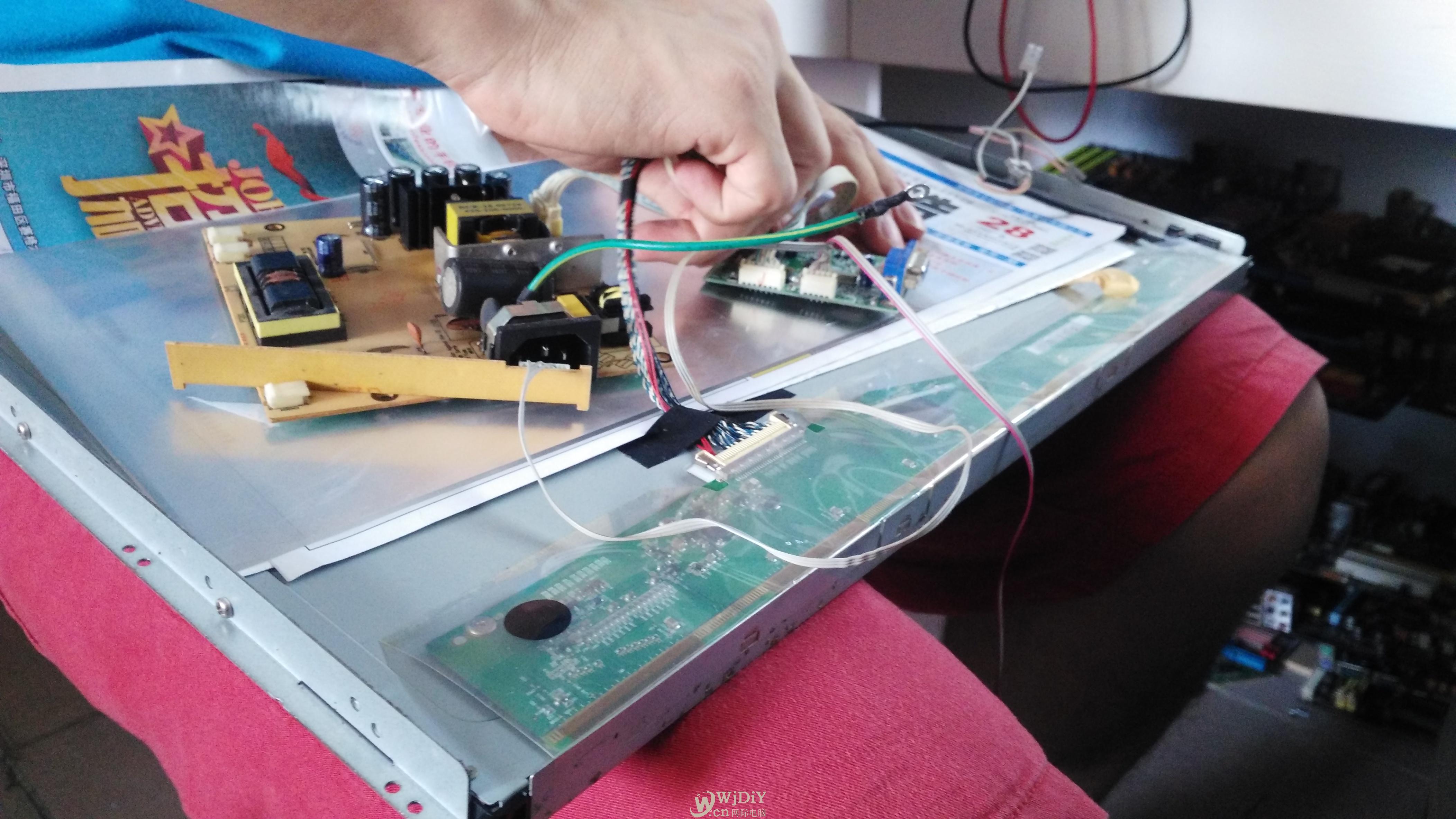 結果一看電路板的高壓壞了,于是找了個舊的電路板把其高壓拆下再裝上損壞的電路板上后,接屏看看還是不亮。在高壓板上找到12v地線,開啟,三個地方,12v用紅色信號用黃色線,黑線接地后,焊接好,這個在電源板后面。12v要接到一個電感后面,這樣好了。